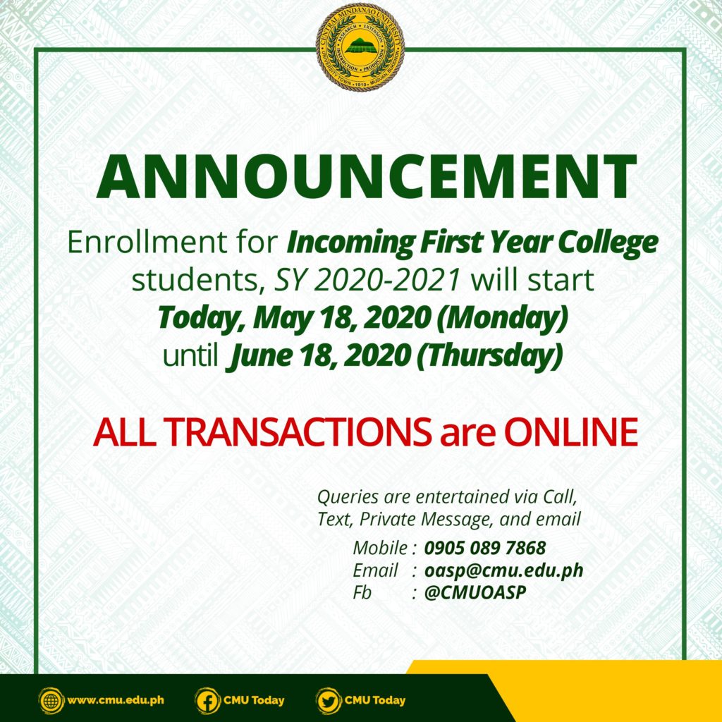 ANNOUNCEMENT: Enrollment for Incoming First Year College students, SY 2020-2021.