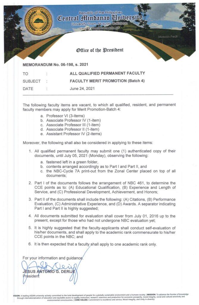 ANNOUNCEMENT: Memorandum No. 06-198, s. 2021 – FACULTY MERIT PROMOTION (Batch 4) Deadline of Application is on July 5, 2021. Share tweet