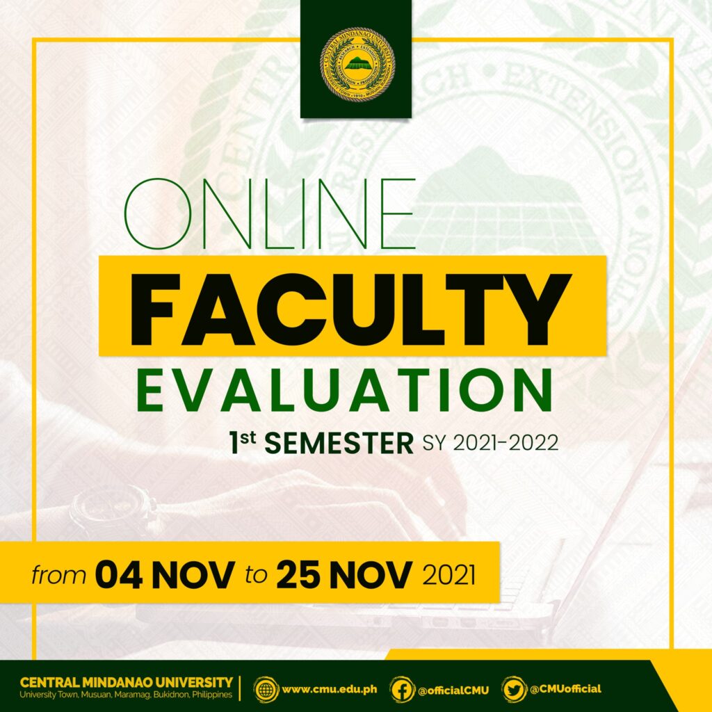 ANNOUNCEMENT: Please be informed that the ๐—ข๐—ป๐—น๐—ถ๐—ป๐—ฒ ๐—™๐—ฎ๐—ฐ๐˜‚๐—น๐˜๐˜† ๐—˜๐˜ƒ๐—ฎ๐—น๐˜‚๐—ฎ๐˜๐—ถ๐—ผ๐—ป for the ๐˜ง๐˜ช๐˜ณ๐˜ด๐˜ต ๐˜ด๐˜ฆ๐˜ฎ๐˜ฆ๐˜ด๐˜ต๐˜ฆ๐˜ณ ๐˜ฐ๐˜ง ๐˜š๐˜  2021-2022 will be accessible starting ๐—ก๐—ผ๐˜ƒ๐—ฒ๐—บ๐—ฏ๐—ฒ๐—ฟ ๐Ÿฐ, ๐Ÿฎ๐Ÿฌ๐Ÿฎ๐Ÿญ and will be closed on ๐—ก๐—ผ๐˜ƒ๐—ฒ๐—บ๐—ฏ๐—ฒ๐—ฟ ๐Ÿฎ๐Ÿฑ, ๐Ÿฎ๐Ÿฌ๐Ÿฎ๐Ÿญ.