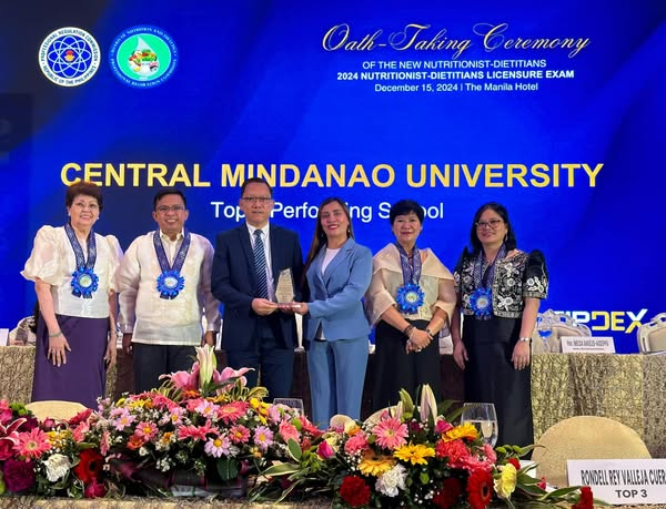 [LOOK] Oath-taking of new Professional Nutritionist-Dietitians and the Awarding of a Plaque of Recognition to Central Mindanao University for achieving First Place (Top Performing School) in the November 2024 Nutritionist-Dietitian Licensure Examination with a Passing Performance of 100.00% on December 15 at the Fiesta Pavilion, Manila.