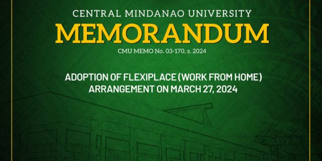 Read More »[MEMORANDUM] Consistent with CSC Memorandum Circular No. 06, s. 2022, the University will adopt the Flexiplace (Work from Home) arrangement on March 27, 2024 (Wednesday). This is to provide time for our personnel to prepare for the observance of Maundy Thursday (March 28) and Good Friday (March 29). However, personnel who will opt to physically report to work on March …