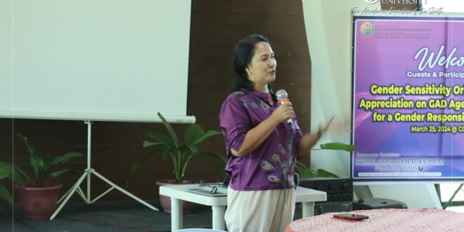 Read More »[HAPPENING NOW] Gender Sensitivity Orientation and Appreciation on GAD Agenda Preparation for a Gender Responsive University at the UCGAD Hall, March 25, 2024, with Prof. Rosalyn R. Echem, faculty from Western Mindanao State University and a member of Philippine Commission on Women National Gender Batch 5, as the resource speaker. #gendersensitivity #genderresponsiveuniversity #cmuucgad