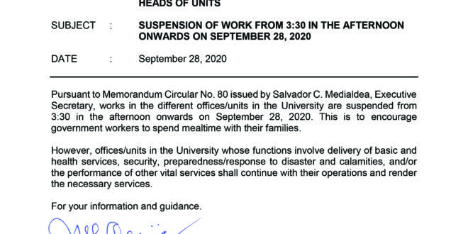 Read More »Pursuant to Memorandum Circular No. 80 issued by Salvador C. Medialdea, Executive Secretary, works in the different offices/units in the University are suspended from 3:30 in the afternoon onwards on September 28, 2020. This is to encourage government workers to spend mealtime with their families.