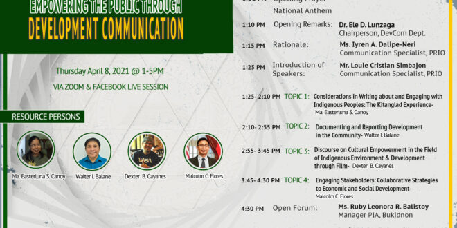 Read More »The graduate seminar class of the Department of Development Communication hosts a webinar on empowering the public through development communication, in partnership with the Public Relations and Information Office (PRIO), Kapisanan ng mga Brodkaster ng Pilipinas (KBP), Philippine Information Agency (PIA), Provincial Government of Bukidnon, and the Public Affairs, Information and Assistance (PAIA), today, via Zoom.