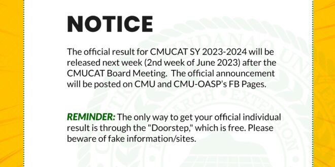 Read More »[NOTICE] The official result for CMUCAT SY 2023-2024 will be released next week (2nd week of June 2023) after the CMUCAT Board Meeting. The official announcement will be posted on CMU and CMU-OASPโs FB Pages. Reminder: The only way to get your official individual result is through the “Doorstep,” which is free. Please beware of fake information/sites. For more information, …