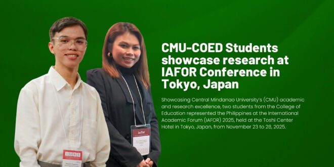 Showcasing Central Mindanao University’s (CMU) academic and research excellence, two students from the College of Education represented the Philippines at the International Academic Forum (IAFOR) 2025, held at the Toshi Center Hotel in Tokyo, Japan, from November 23 to 28, 2025.