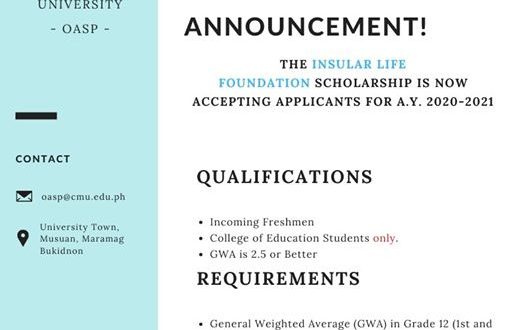 THE INSULAR LIFE FOUNDATION SCHOLARSHIP is now ACCEPTING APPLICANTS FOR A.Y. 2020-2021 DEADLINE OF SUBMISSION JULY 31, 2020 (FRIDAY)APPLICATION FORM: https://drive.google.com/file/d/1ExVczvNg3FZ4t8dnps6SV34Vfw7XtSLq/view?usp=sharing Submit your requirements at the Office of Admissions, Scholarships, & Placement (OASP).