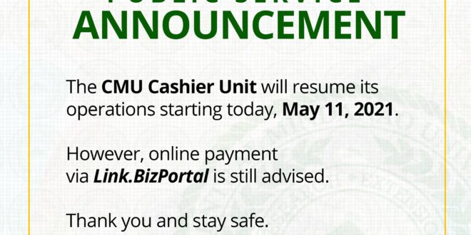 𝗣𝗨𝗕𝗟𝗜𝗖 𝗦𝗘𝗥𝗩𝗜𝗖𝗘 𝗔𝗡𝗡𝗢𝗨𝗡𝗖𝗘𝗠𝗘𝗡𝗧 The 𝗖𝗠𝗨 𝗖𝗮𝘀𝗵𝗶𝗲𝗿 𝗨𝗻𝗶𝘁 will resume its operations starting today, 𝗠𝗮𝘆 𝟭𝟭, 𝟮𝟬𝟮𝟭. However, online payment via 𝙇𝙞𝙣𝙠.𝘽𝙞𝙯𝙋𝙤𝙧𝙩𝙖𝙡 is still advised. Thank you and stay safe.