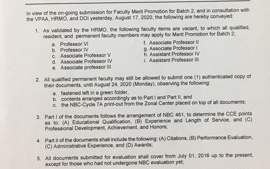 ANNOUNCEMENT: Memorandum No. 08-322, s. 2020 – FACULTY MERIT PROMOTION (Batch 2)