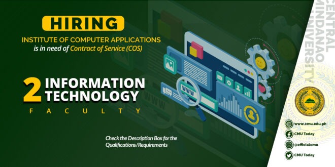 Minimum Qualifications:1. Preferably with Master’s Degree/Units in Development Communication/related field;2. Preferably with Photography NC II;3. Must have an outstanding scholastic record; and4. Trained in flexible learning REQUIREMENTS:1. Resume2. Transcript of records (TOR);3. Certificate of seminars and workshops attended/participated;4. Certificate of employment from past/current (if applicable); and5. Result of neuropsychiatric examination (Dr. Jose J. Coruna, Sr. ofSacred Heart Neuropsychiatric Screening Center, …