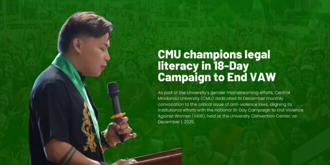 As part of the University’s gender mainstreaming efforts, Central Mindanao University (CMU) dedicated its December monthly convocation to the critical issue of anti-violence laws, aligning its institutional efforts with the national 18-Day Campaign to End Violence Against Women (VAW), held at the University Convention Center, on December 1, 2025.