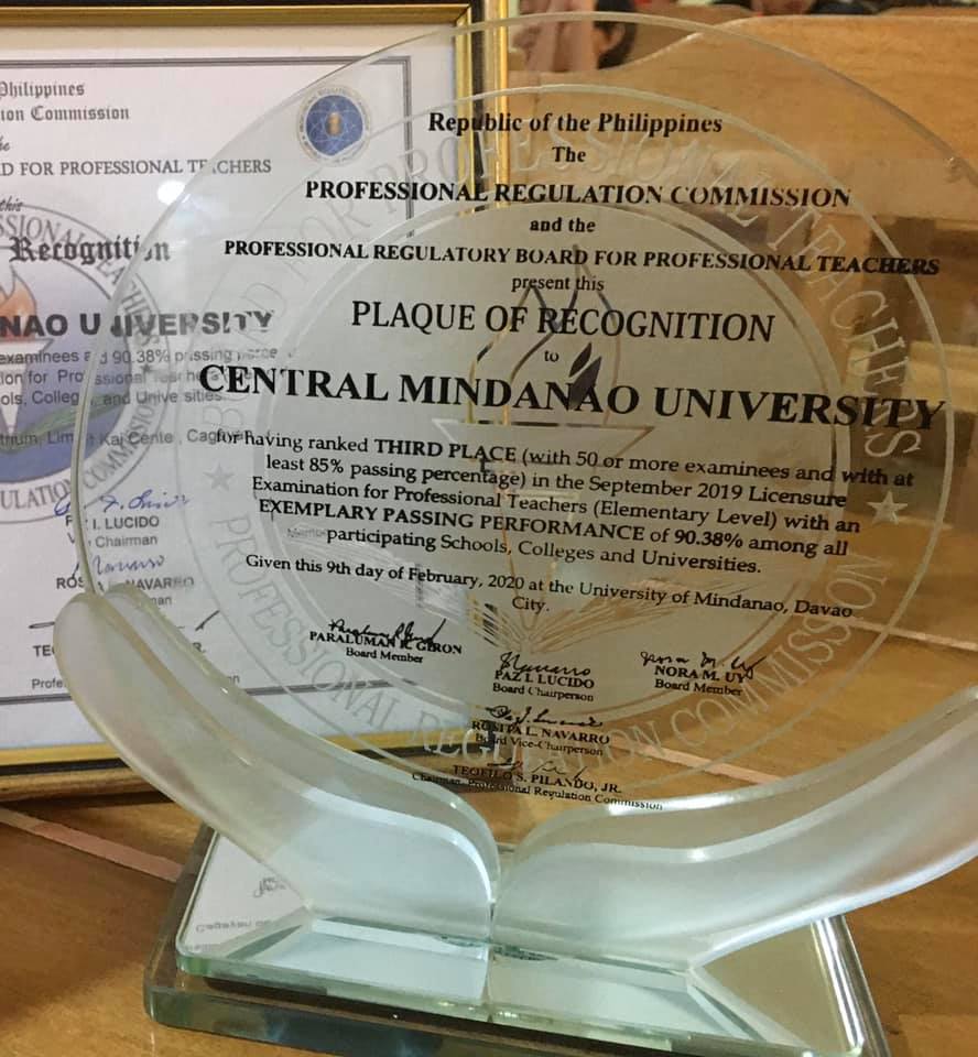 CMU is recognized by PRC for ranking THIRD (with 52 examinees and 90.38 passing percentage) in the September 29, 2019 Licensure Examination for Professional Teachers (Elementary Level) among participating Schools, Colleges, and Universities.