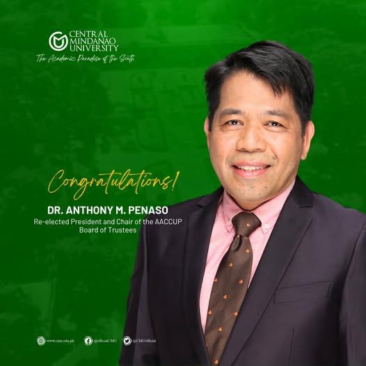 Central Mindanao University proudly congratulates Dr. Anthony M. Penaso, President of Bohol Island State University, on his re-election as President and Chair of the Accrediting Agency of Chartered Colleges and Universities in the Philippines, Inc. (AACCUP) Board of Trustees.