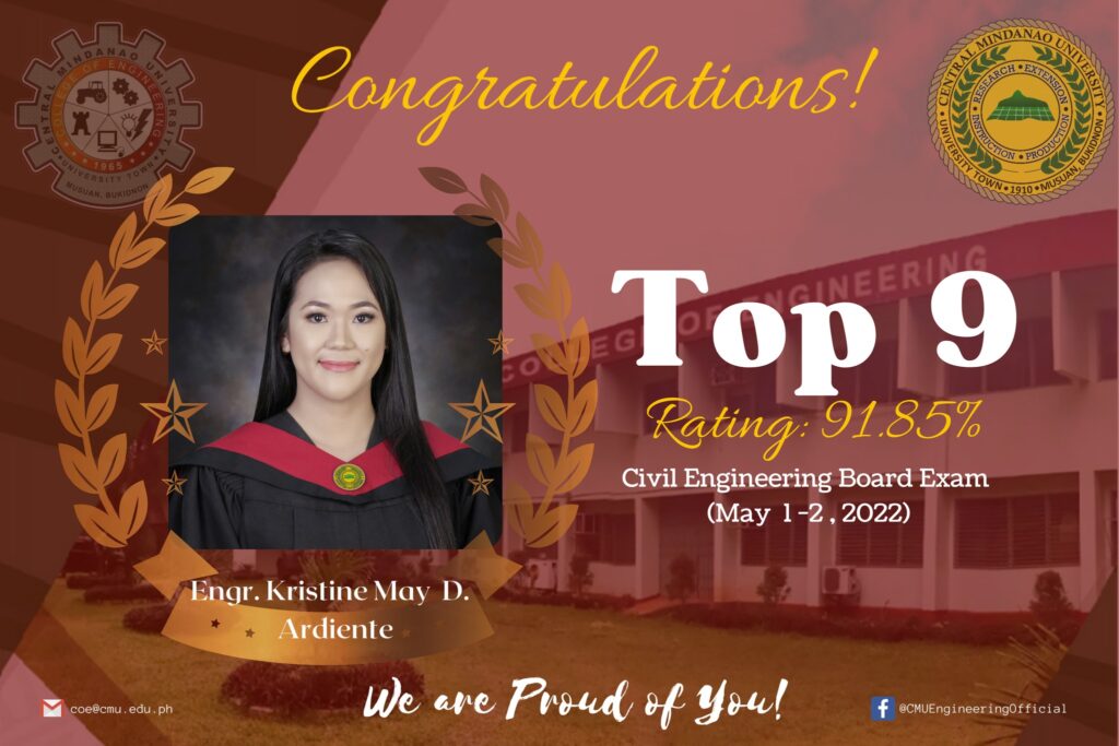 Congratulations to our newly registered civil engineers especially to Engr. Kristine May D. Ardiente, 9th placer (91.85%) in the May 2022 Civil Engineer Licensure Examination! Kudos to the Department of Civil Engineering, College of Engineering