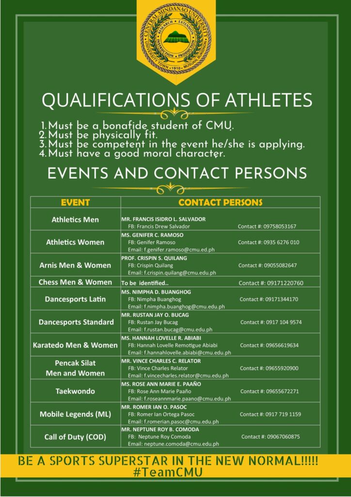 Information from Prof. Proxy Galendez, University Sports Coordinator