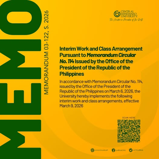 In accordance with Memorandum Circular No. 114, issued by the Office of the President of the Republic of the Philippines on March 6, 2026, the University hereby implements the following interim work and class arrangements, effective March 9, 2026