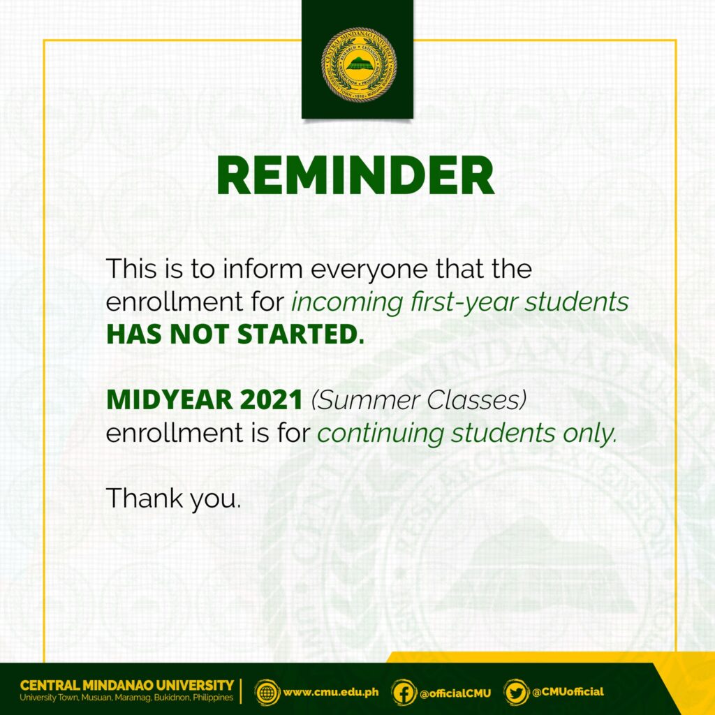 REMINDER: This is to inform everyone that the ๐—ฒ๐—ป๐—ฟ๐—ผ๐—น๐—น๐—บ๐—ฒ๐—ป๐˜ ๐—ณ๐—ผ๐—ฟ ๐—ถ๐—ป๐—ฐ๐—ผ๐—บ๐—ถ๐—ป๐—ด ๐—ณ๐—ถ๐—ฟ๐˜€๐˜-๐˜†๐—ฒ๐—ฎ๐—ฟ ๐˜€๐˜๐˜‚๐—ฑ๐—ฒ๐—ป๐˜๐˜€ ๐—ต๐—ฎ๐˜€ ๐—ป๐—ผ๐˜ ๐˜€๐˜๐—ฎ๐—ฟ๐˜๐—ฒ๐—ฑ. ๐— ๐—ถ๐—ฑ๐˜†๐—ฒ๐—ฎ๐—ฟ ๐Ÿฎ๐Ÿฌ๐Ÿฎ๐Ÿญ (Summer Classes) enrollment is for ๐—ฐ๐—ผ๐—ป๐˜๐—ถ๐—ป๐˜‚๐—ถ๐—ป๐—ด ๐˜€๐˜๐˜‚๐—ฑ๐—ฒ๐—ป๐˜๐˜€ ๐—ผ๐—ป๐—น๐˜†.
