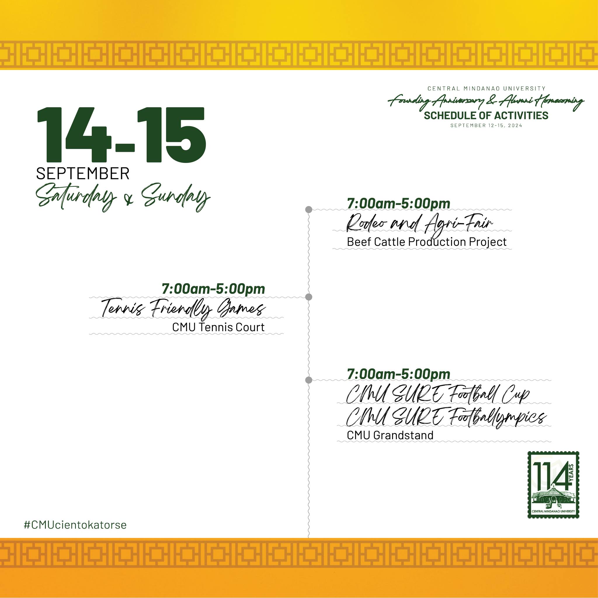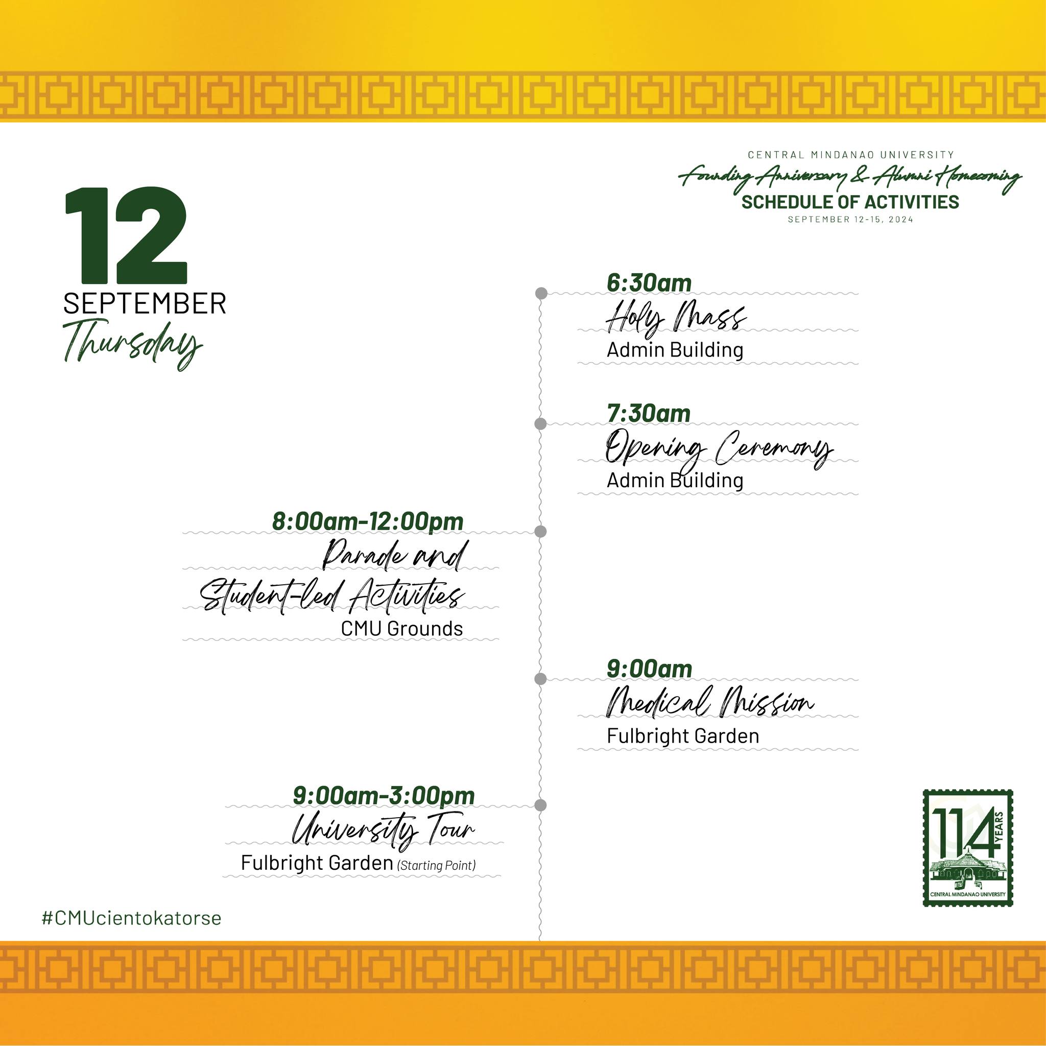 [#CMUcientokatorse] Check out the schedule of activities for CMU’s 114th Founding Anniversary and Alumni Homecoming! 🥳✨