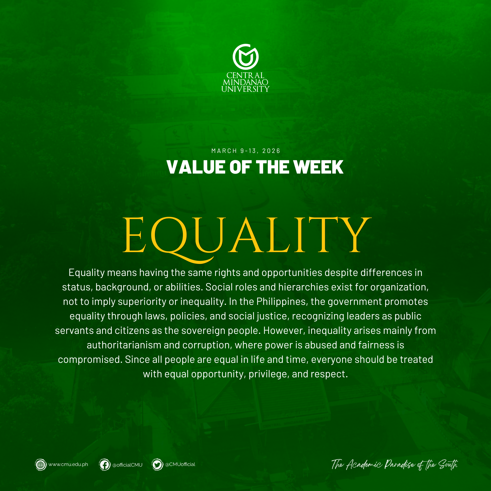 In the Philippines, the government promotes equality through laws, policies, and social justice, recognizing leaders as public servants and citizens as the sovereign people. However, inequality often stems from authoritarianism and corruption, where power is abused and fairness is compromised. Since all people are equal in life and time, everyone should be treated with equal opportunity, privilege, and respect.